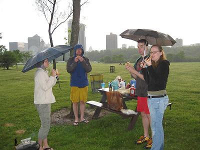 The last time Trevor invited me to grill there was snow on the ground. This time, there were thunderstorms overhead. Despite the rain and cold, we had a great time tonight. Christie summed up the experience well: "I was miserable, but I had a lot of fun." See the pictures below.